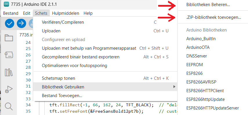 Ofwel haal je een bibliotheek binnen uit de lijst (Bibliotheken Beheren), ofwel download je die eerst via de links in de sketches, en installeer je die als "zip".