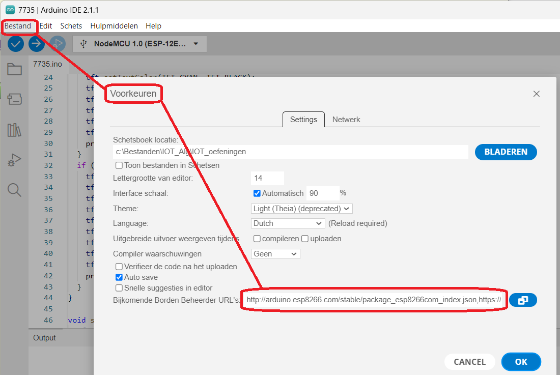 Dit is de compiler, waarmee je sketches schrijft en de code uploadt naar de microcontroller. In het menu van de Arduino IDE, klik op "Bestand" - "Voorkeuren", en op de lijn "borden beheerder" plak je volgende lijn: